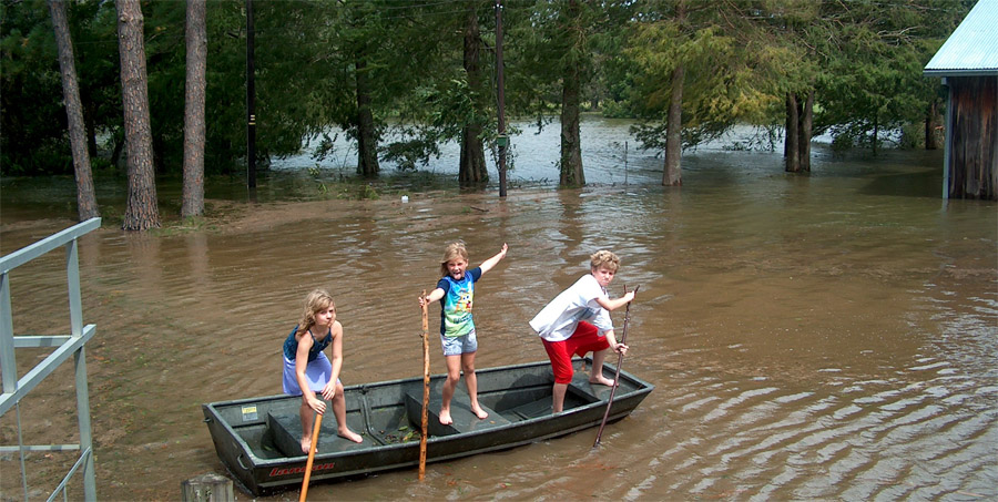 There are funny things, too…like the time my brother, dressed in his nightshirt, carried his dog (a 60 pound pooch) alllllll the way out of the yard to the middle of the highway (the ONLY spot NOT underwater) so said pooch could go potty. And my husband “boatlifting” my parents with their cat to the house next door because it was a bit higher than their house, and the water was getting too close for comfort. (The cat was more freaked out than anyone.)